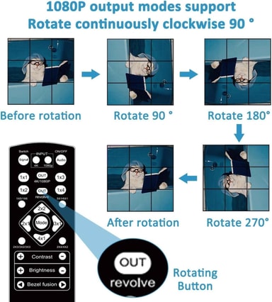 FunktionerDeler et højopløsningsbilledsignal i 9 blokke og distribuerer til 9 skærme