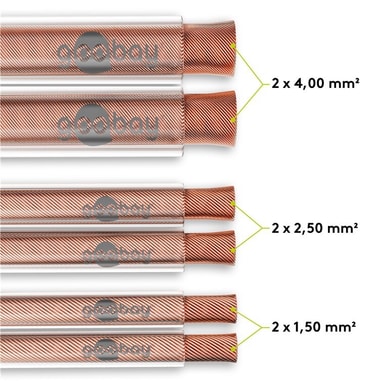 Højttalerkabel med højkvalitetsledning (CCA: kobberbeklædt aluminium) for gode transmissionsegenskaber, f.eks. mellem hi-fi-systemer og højttalere