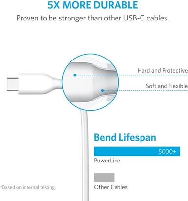 Den problemfrie overgang fra det hårde cover til den fleksible gummibeskytter i det mest anstrengte område gør, at kablet holder op til 5 gange længere end andre USB-C-kabler.