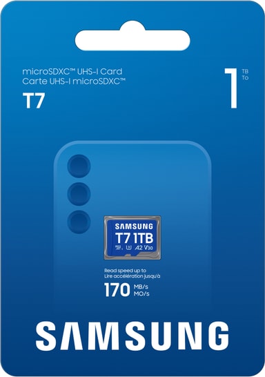 Samsung T7 micro SDXC-kortet leverer 1024 GB lagerplads, problemfri 4K UHD-optagelse, hurtig 170MB/s læsehastighed, A2 app-ydeevne og robust 6-proof holdbarhed for pålidelig sikkerhed.Læs mere om produktet