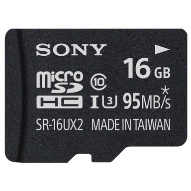 Micro SDXC hukommelseskort fra Sony med en kapacitet på 16 GB, ultra høj hastighed samt SD adapter i fuld størrelse.