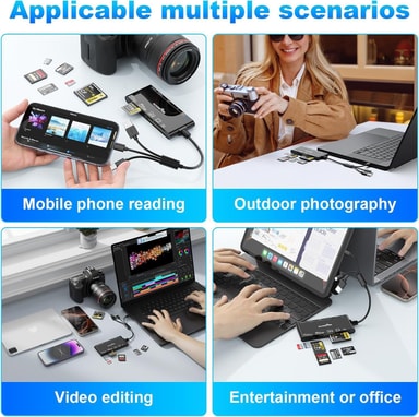 NÖRDIC Multi-Kortlæser med USB-C, USB-A og Lightning-tilslutning er et alsidigt værktøj til at læse og overføre data fra flere forskellige hukommelseskort, herunder SD, MicroSD, CF, M2 og MS. Perfekt til fotografer, indholdsskabere og alle, der hurtigt ønsker at overføre filer til en computer, tablet eller mobil – uanset operativsystem. Plug & Play, ingen drivere kræves.Specifikationer: