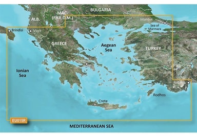 Enestående kortdækning af kystområder Giver branchens bedste dækning, klarhed og detaljerigdom med opdaterede søkort over kystområder, der integrerer Garmin og Navionics® data Auto Guidance 1 teknologi beregner en rute med din ønskede dybde og frihøjde og foreslår dig en rute, du kan følge Med skyggelægning af dybdeområder for op til 10 dybdeområder kan du hurtigt se måldybden 30 cm dybdekurver giver en mere nøjagtig gengivelse af bundens struktur på det forbedrede fiskekort BlueChart g3 kort over kystområder giver branchens bedste dækning, klarhed og detaljerigdom med integreret Garmin og Navionics data. Indeholder også Auto Guidance 1 teknologi, som bruger din ønskede dybde og frihøjde til at beregne ruter og foreslå en rute, du kan følge — overlejret på dit søkort. NOAA rasterkartografi er også tilgængelig som gratis download via ActiveCaptain appen. Den giver din plotter papirkortlignende visninger af NOAA undersøgte områder, hvor individuelle interessepunkter er mærket med tilsvarende oplysninger om længde- og breddegrad. Global dækning er tilgængelig pr. region som tilbehørskort eller via download. Hver region sælges separat. Auto Guidance teknologi Auto Guidance funktionen 1 beregner en foreslået rute ved at bruge din ønskede dybde og frihøjde. Skyggelægning i dybdeområde For at give et klart billede af lavt vand, der bør undgås, kan du skyggelægge brugerdefineret minimumsdybde. Detaljerede dybdekurver BlueChart g3 kort har dybdekurver med 30 cm intervaller, som giver en mere nøjagtig gengivelse af bundens struktur på det forbedrede fiskekort. Skyggelægning af lavt vand For at give et klart billede af lavt vand, der bør undgås, kan du skyggelægge brugerdefineret minimumsdybde. Dækning Including all of the Greek coast and Aegean Sea: Turkey from Istanbul and Sea of Marmara to Antalya: and Brindisi, Italy. 1 Auto Guidance er kun til planlægningsformål og kan ikke erstatte sikker navigation. Auto Guidance er ikke inkluderet i forudindlæste BlueChart g3 til ECHOMAP™ Plus-seriens plottere