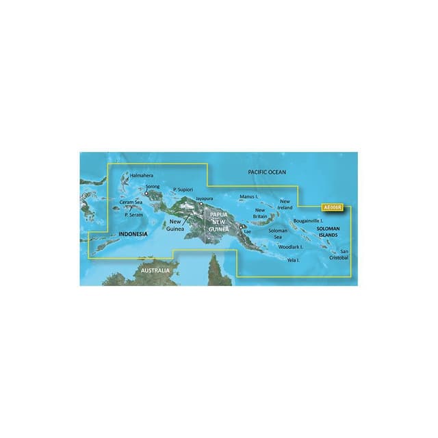 Our Advanced Chart Offering Derived from official charts and private sources to provide navigational aids, spot soundings, depth contours, tides and currents, and detailed harbors and marinas Depth Range Shading for up to 10 depth ranges enables you to view your target depth at a glance Up to 1-foot contours provide a more accurate depiction of the bottom structure for improved fishing charts and navigation in swamps, canals and marinas Shallow Water Shading feature allows for depth shading at a user-defined level to aid in navigation Worldwide coverage available Keep your charts up to date with our industry-leading New Chart Guarantee and discount card update program Advanced Chart Detail Detailed charts help the mariner guide their boat in and out of port with confidence. Depth Range Shading Displays high-resolution Depth Range Shading for up to 10 depth ranges so you can view your designated target depth. Detailed Contours BlueChart g2 HD features 1-foot contours that provide a more accurate depiction of bottom structure for improved fishing charts and enhanced detail in swamps, canals and port plans. Täckning Coverage of Indonesia southeast and east of Sulawesi including Timor, all of New Guinea, the Solomon Islands, Osprey Reef, nearly all of Bathurst and Melville Islands and the Cobourg Peninsula of Australia. Ports include Ambon and Ternate in Indonesia: Snake Bay, Australia: Lae, Rabaul and Port Moresby, PNG and Honaira, SI.
