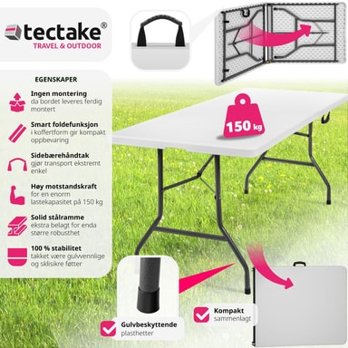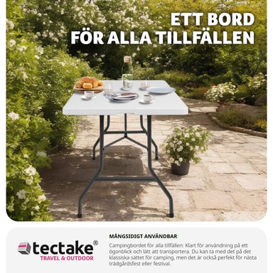 Nyd mange afslappende timer hjemme i haven, på terrassen eller på campingpladsen! Dette praktiske og sammenklappelige campingbord er det perfekte valg til enhver udflugt eller hyggestund udendørs. Uanset om du skal bruge det som spisebord til campingferien, som ekstra bord til grillfesten eller som praktisk arbejdsplads i garagen, leverer det funktionalitet og pålidelighed.