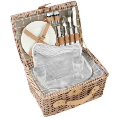 Picnic kurven imponerer med sit 10-delte servicesæt, bestående af to keramiktallerkener, to brudsikre vinglas og bestik i rustfrit stål - alt sikkert opbevaret og klar til brug. En tjenerkniv og to krydderibeholdere fuldender picnic-oplevelsen. Det integrerede kølerum sørger for, at dine madvarer og drikkevarer forbliver friske og nydelige, selv ved højere temperaturer.