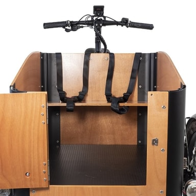 EvoBike Duo Cargo Box är en slimmad elektrisk lådcykel som är perfekt för dig som är ute efter en elcykel där du kan lasta mycket. Du får enkelt plats med flera barn, husdjur och packning i elcykelns låda som är försedd med sittbänkar (med plats för två barn) och säkerhetsbälten. Duo Cargo Box har en svartlackerad ram samt detaljer i borstat aluminium och läder vilket ger lådcykeln en mer designad look.