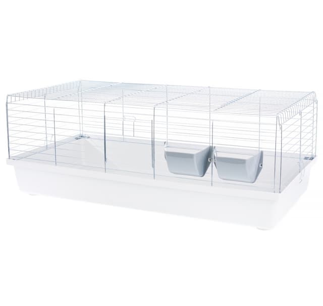 Rabbit 120-buret til kaniner og marsvin er rummeligt indeni og leveres med alt det nødvendige tilbehør til dit lille kæledyr: høbeholder, vanddyse, madskål og et lille hus til at sove i, alt sammen lavet af plastik.