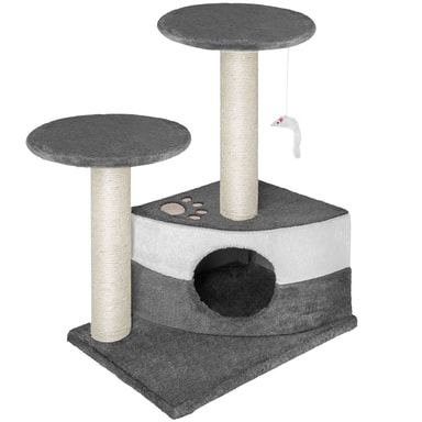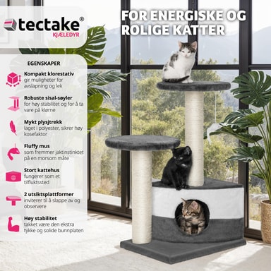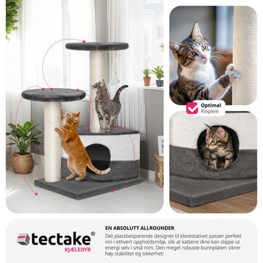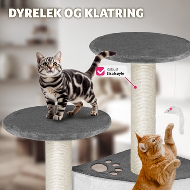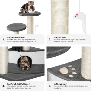 Derudover er kattetræet udstyret med en hyggelig hule, hvor din kat kan trække sig tilbage og slappe af, samt en sjov legemus, der inviterer til timevis af leg. Med dette kradsetræ kan din kat lege, klatre og holde udkig fra de forskellige niveauer, alt sammen på en pladsbesparende grundflade.