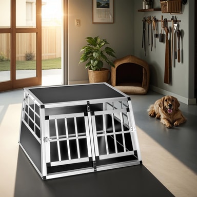 Dette dobbelte hundebur er den ideelle løsning til nem og sikker transport af en eller to af dine elskede hunde. Det smarte design og de eksklusive materialer sikrer ikke kun høj funktionalitet i hverdagen, men også maksimal komfort for dine firbenede venner. Dette dobbelte transportbur er fremstillet af en kombination af let aluminium og furneret træ, hvilket gør det både ekstremt let og utrolig stabilt.