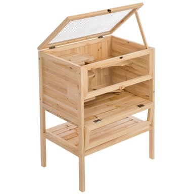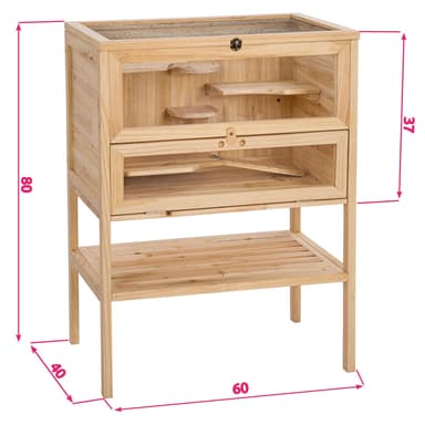 Dette fantastiske hamsterbur til små dyr giver dine kære et perfekt hjem. Fire plastglasvinduer giver dig et direkte kig ind på alle niveauer i dit hamsterbur. Loftet af trådnet sikrer tilførsel af frisk luft og kan åbnes helt. Den nederste del af fronten på dette hamsterbur kan åbnes og således lette rengøring af buret. Via en rampe kan dit kæledyr komme op til de øverste etager. Dette hamsterbur har også et lagerområde i den nederste del, hvor der for eksempel kan opbevares foder og spåner.