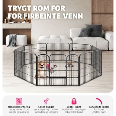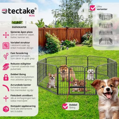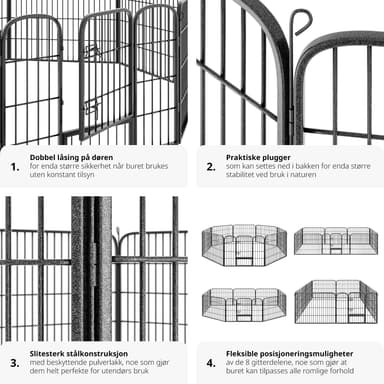 Denne hvalpegård er den perfekte løsning for kæledyrsejere, der ønsker at give deres små venner et trygt og sikkert sted. Med dens robuste konstruktion, fleksible opstillingsmuligheder og praktiske funktioner, er den et must-have for enhver, der ønsker det bedste for deres kæledyr.