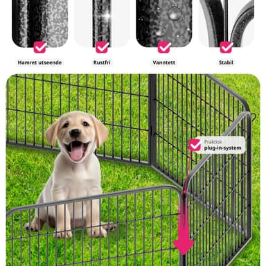 Funktionel og alsidig: Uanset om du har brug for en sikker legeplads indendørs eller en robust indhegning udendørs, opfylder denne hvalpegård alle dine krav. Den kan opstilles i forskellige former og størrelser afhængig af plads og behov.