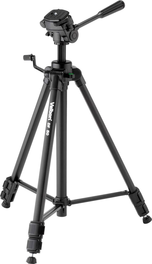 Velbon DF 50 tripod har et 3-vejs hurtig-slip pan hovede, og Sure-grip håndtaget er positioneret på venstre side for en nem adgang til kameraknapperne. 3-sektions ben med fliplås, gummibelagte fødder og jordspyd sørger for god stabilitet.