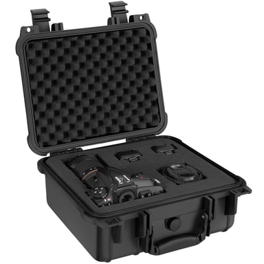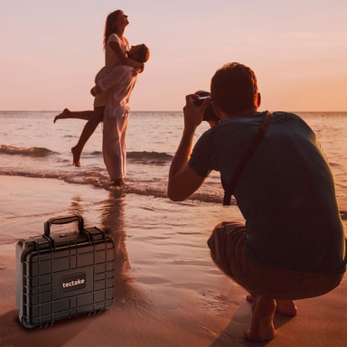 Den lette kamerataske fra tectake er designet til at beskytte dit kameraudstyr optimalt. Den robuste yderskal gør denne kuffert immun mod stød og vejrforhold. Spændelukningerne og fortætningsgummiringen beskytter imod snavs, fugt, regn og vand. Trykudligningsventilen i transportkufferten sørger konstant for en ligevægt imellem trykket inde og udenfor kamerataske. I skumindsatsen, som man frit kan indrette kufferten med, kan det kostbare indhold ligge sikkert på sin plads. Man kan dermed trygt transportere sit skrøbelige udstyr i den robuste kamerakuffert.
