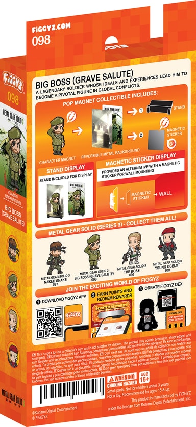 First 4 Figures Figgyz Metal Gear Solid 3 Pop Magnet actionfiguren har en vendbar metalplade med to forskellige udstillingsmuligheder, en pixel-art-inspireret figur, en 3D magnetisk pop-out effekt, en udstillingssokkel og et magnetisk klistermærke.Læs mere om produktet