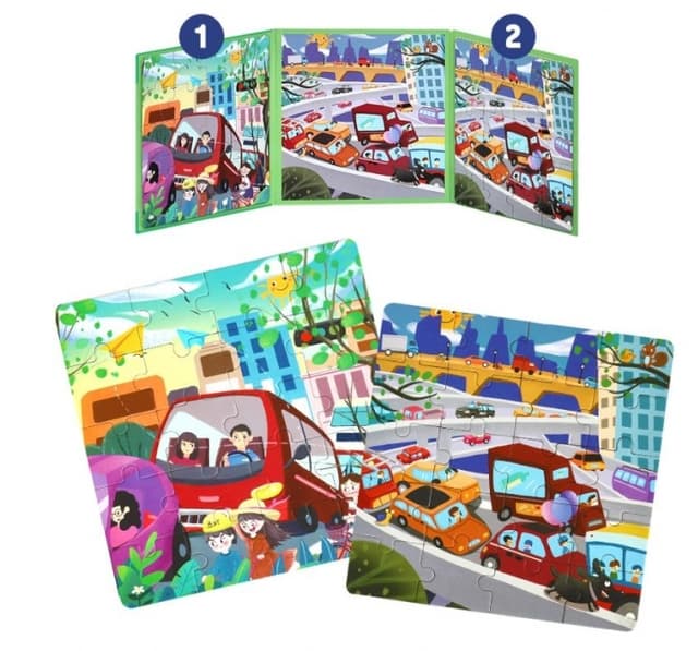 Dette puslespil har runde og glatte kanter, hvilket passer til børns små følsomme hænder. Derudover er puslets farver lavet af sojablek, hvilket er miljøvenligt og lugtfrit. At lægge puslespil er godt for et barns hukommelse, tålmodighed, koncentration, logiske tænkning og koordination! Dette puslespil er samlet i en bog med tre forskellige motiver, hvilket gør det nemt at holde styr på alle brikkerne og derefter folde puslebogen sammen til nem opbevaring eller til at tage med på rejse.