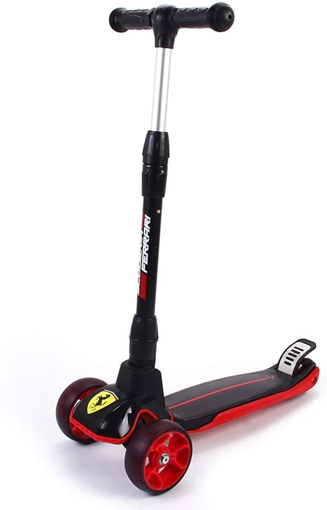 Ferrari sammenfoldelig tvillingescooter til børn. Aluminiumsramme, grebsvenlige gummihåndtag, vandafvisende PP fodplade, højde & sænkbar styrepind 64, 71, 78cm, højdæmpende PU-forhjul med indbygget LED-lys. Robust design, perfekt til børn at træne balance- og koordinationsteknikker. De blinkende LED-hjul gør det nemmere at overbevise dit barn om fysisk aktivitet, uden behov for batteri. Anbefalet maksimal vægt 50 kg, anbefalet alder 3-10 år.