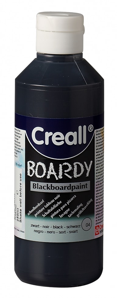 Tavlemaling 250 ml. Ønsker du at bruger en dør, en del af væggen eller andet som en sort kridttavle skal du bruge tavlemaling. Maler du det ønskede emne med Creall tavlemaling kan du efterfølgende skrive med kridt direkte på din nye tavle, da det så fungerer som kridttavle. Tavlemalingen bør påføres i flere lag for bedre dækning. Du kan skrive på den sorte kridttavle med almindelig kridt og viske det ud igen. Præcist som på tavlen i skolen. Med denne tavlemaling får du hele 250 ml maling som dækker godt. Der går ca 100 ml til en kvadratmeter så maler du med 2 lag tavlemaling burde den 250 ml række til godt og vel én m2. Held og lykke med ""produktionen"" af din kridt skoletavle.