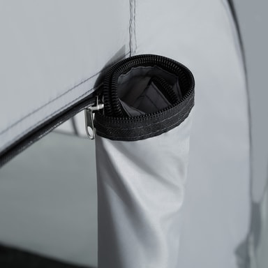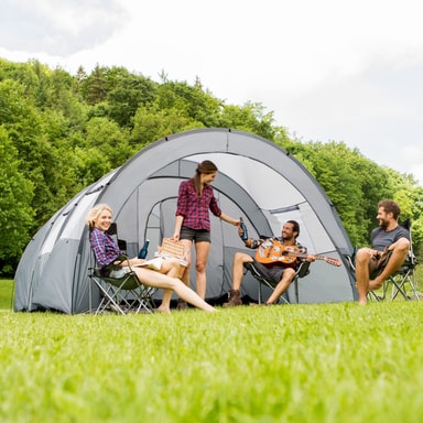 En drøm for enhver campist! Det store, komfortable tunneltelt er ideelt for familier eller vennegrupper. Det overdækkede fortelt inviterer til afslapning i skyggen, og tilbyder lagerplads til campingredskaber. Teltet kan monteres og nedtages på et par minutter og er alligevel stabilt. Kort sagt: det ideelle telt til en weekend udendørs!
