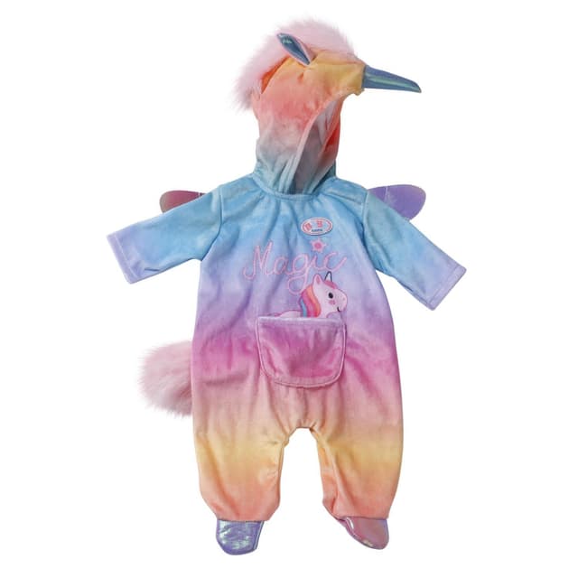 En enhörning är så magisk – och BABY är extra förtrollande i sin enhörningsdräkt. Dräkten är gjord av ett mysigt regnbågstyg och luvan har söta öron på, samt ett glitterhorn och enhörningsman. Det finns till och med glittervingar på ryggen och en rosa svans. I fickan fram göms en söt enhörning. Det är ren magi! Tillbehör till BABY born i hög kvalitet. Passar till barn från 3 år.