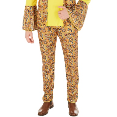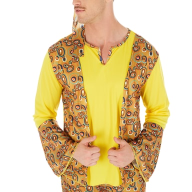 Kostume til mænd, Disco Star, inkluderer en overdel med påsyet vest af behagelig jersey-elastik: Det farverige kostume er holdt i det typiske 60er og 70er look. Dertil kommer også et par super cool bukser med elastik i taljen. Inkl. Pandebånd.Læs mere om produktet