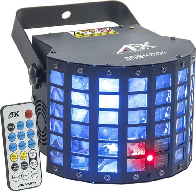 Afx 'derby gobo' partylys super flot lyseffekt med blanding af ""derby"" effekt og laser. 13 x dmx kanaler. 1 x 30w 4-en-1 rgbw led diode. 1 x 150mw rød laser. 1 x 50mw grøn laser. 8 indbyggede programmer. dimmer & strobe. Fjernbetjening medfølger.