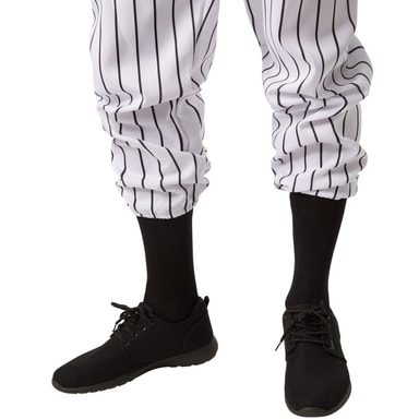 Herrekostumet, Baseballspiller, består af en stribet overdel med påsyet baseball applikation og store knapper, et par lange, stribede bukser, bælte samt et par sokker. Materiale: 100% polyester.