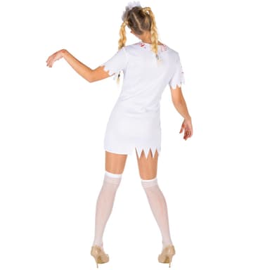 Halloweenkostume af polyesterstof, kjole med print og gennemgående lynlås, et par strømper med print, mundbeskytter med tryk og elastik samt hovedbeklædning med rødt kors. Materiale: 100 % Polyester.