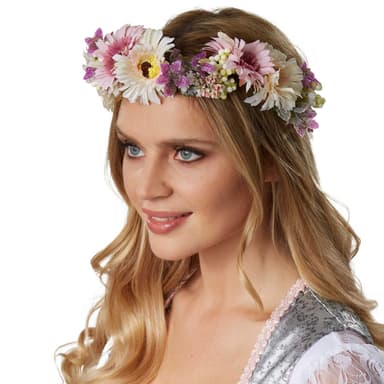Den fornemme blomsterkrans, blomsterunder, er et blikfang til mange lejligheder. Den stilfulde hovedpynt fungerer overbevisende med sin naturlighed og med stor kærlighed til detaljen. Takket være satinbåndene kan størrelsen tilpasses individuelt. Den flotte blomsterkrans blomsterunder iscenesætter din påklædning, materiale: Plast, stof.