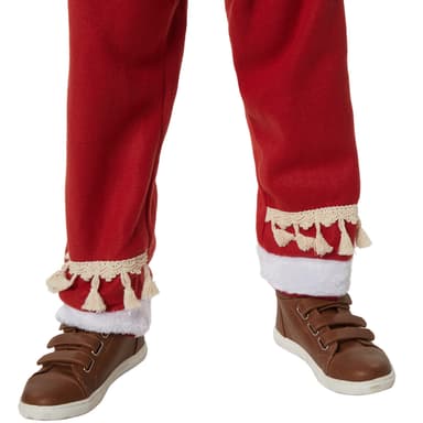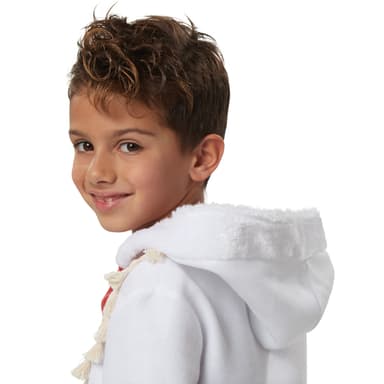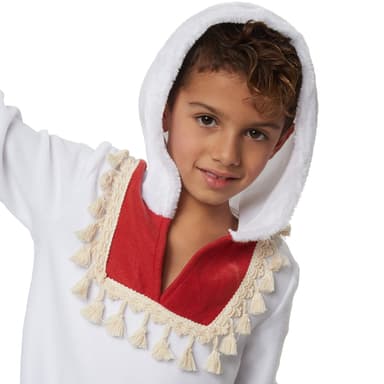 Drengekostumet, cool Eskimodreng, er holdt i hvidt og rødt. Den detaljerige overdel består af en pullover med hætte. For enden af ærmerne samt på sømmen sidder der hvid plys med en rød finish. Den påsyede hætte er også overdådigt sømmet med hvid plys. Halsområdet er lavet af rødt, kvadratisk påsyet fløjl med pyntebort i blomstermønster og en kantbort i hæklet look med kvaster. Fløjlsbukserne har en elastiklinning og er forneden også forsynet med en kantbort i hæklet look med kvaster. Buksebenene afsluttes ligesom på overdelen af hvid plys med en rød afslutning, materiale: 100% polyester.