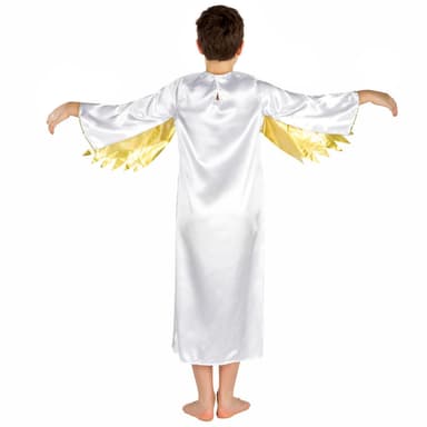 Dette kostume til børn, Den kække engel, består af en tunika med påsyede gyldne vinger, kraven er pyntet med tyl. Et lille selvklæbende båndbånd i nakken gør det let at klæde sig på. Highlights: En himmelsk glimmerstjerne på brystet. Materiale: 100 % polyester.