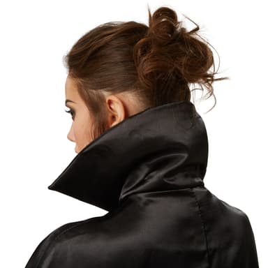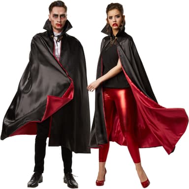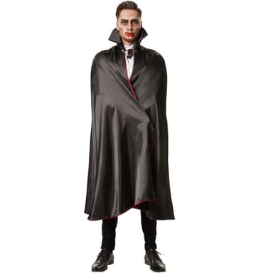Det tofarvede unisexkostume, vampyrkappe, består af en kappe uden ærmer og en krage, der kan klappes op til at snøre. Materiale: 100 % polyester.