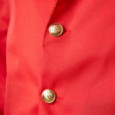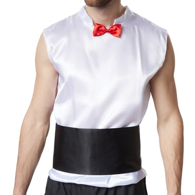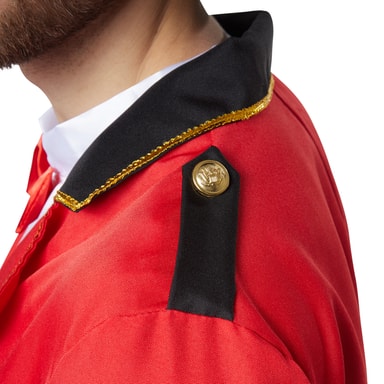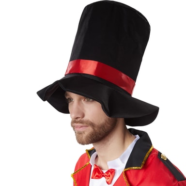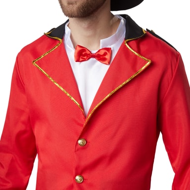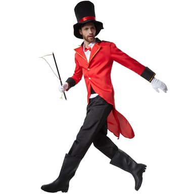 Det femdelte mandekostume, flot cirkusdirektør, består af en frakke, en ærmeløs satinskjorte med sløjfe, et par bukser, et tørklæde og en stor hat. Den røde frakke har bagpå den typiske slids for bedre at kunne gå. Kraven samt ærmerne i sort og rødt består af en gylden pyntebort. Frakken lukkes bagpå med to guldfarvede knapper. De sort udformede skulderklapper er også forsynet med en guldfarvet knap. Den ærmeløse, hvide satinskjorte har en påsyet sløjfe i halsen. De sorte, lange bukser har en gummilinning og er lige skåret. Det sort glimtende tørklæde lukkes med en selvklæbende bånd-lukning. Kostumet komplementeres af den sorte hat med bred skygge og et rødt satinbånd, materiale: 100 % polyester.
