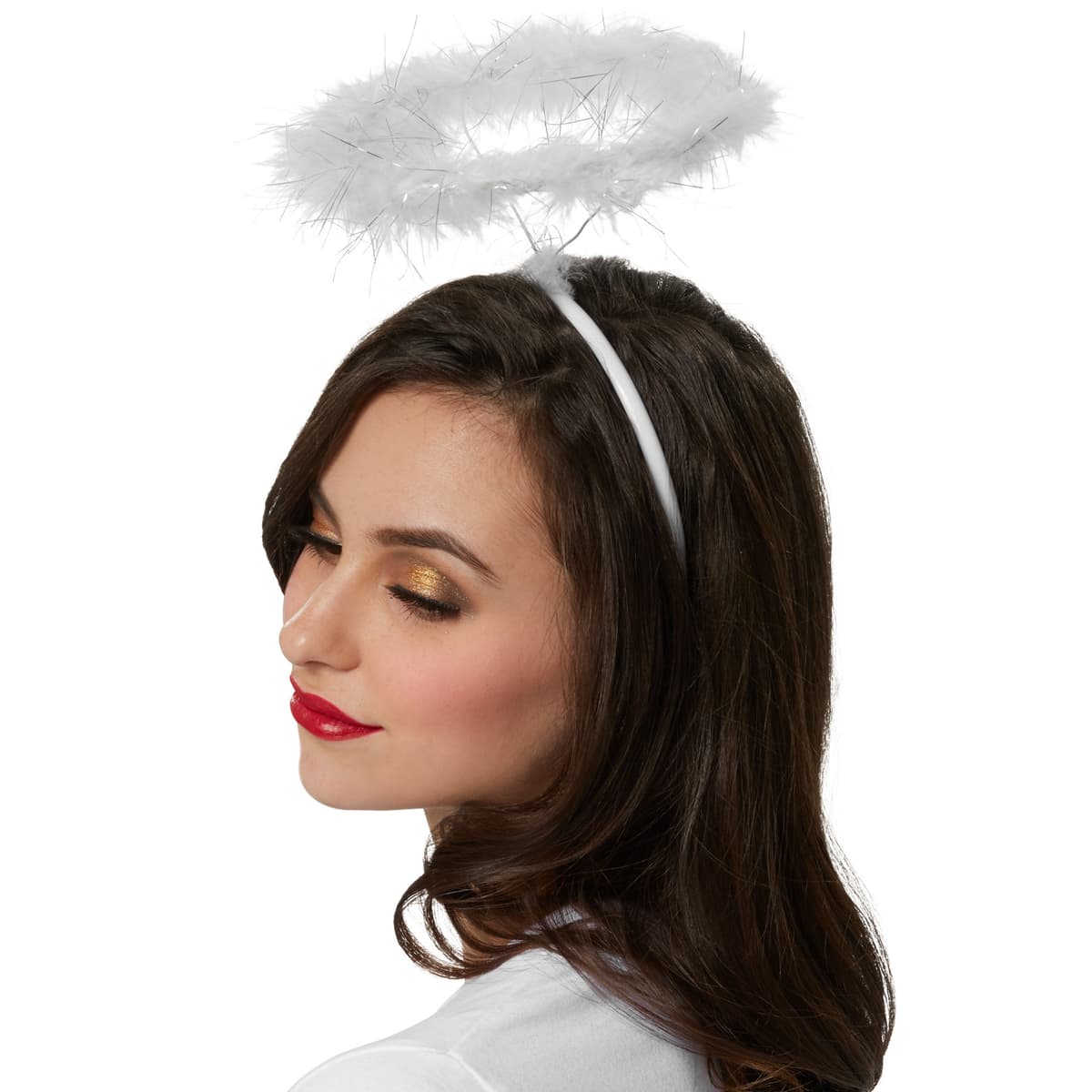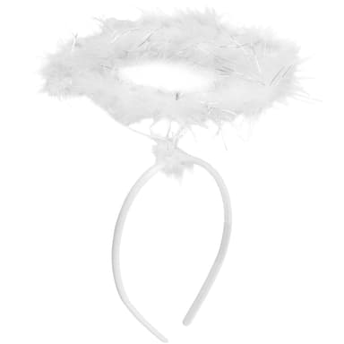 Med denne bløde glorie i hvid kan ingen sige nej til dine ønsker! De bløde dunfjer og de fine sølvstrimler sidder stabiliserende på et bøjeligt, rundt stykke ståltråd, der er forbundet med et hårbånd. De afrundede plastik-dupper på indersiden sikrer, at den sidder godt fast. Takket være den lave vægt kan man uden problemer have glorien på i flere timer, materiale: Polystyren, kalkunfjer, stål.