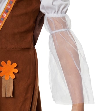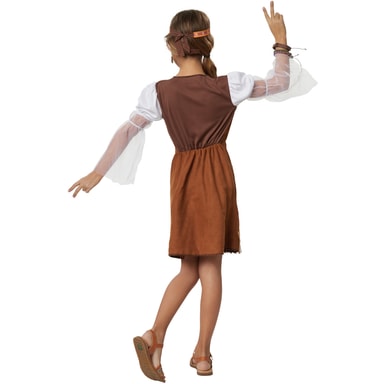 Pigekostumet, Groovy Hippie, består af en kort kjole og en påsyet ærmeløs vest i ruskindslook. På de korte ærmer er der med et elastikbånd påsyet tylstof, som former sig som trompetærmer. Der er også en indsats med elastikbånd i halsen.Læs mere om produktet