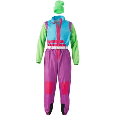 De vilde 80'ere og 90'ere lever igen! Med herrekostumet Retro Ski Dragt bliver du blikfanget til enhver fest. Overallen i strålende farver som lilla, blå, grøn og pink er den perfekte ledsager til fastelavn, karneval eller en skør temafest. Sættet fuldendes med en neon-grøn hue, der perfekt afrunder dit look.