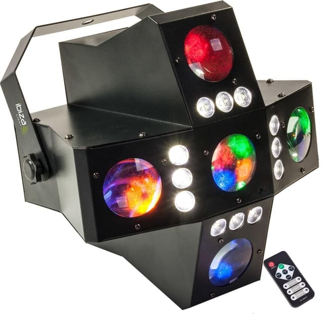 2-i-1 lyseffekt der dækker dansegulvet med farverige goboer med skarpe RGBA lysstråler og strobe effekter.Hastigheden og intensiteten af alle linser og strobe rækker kan styres individuelt. 4 / 28 DMX kanaler. 16 auto programmer. 5 linser, der hver indeholder 4 x 3W RGBA LED'er med 4 forskellige goboer. 12 x 1W hvide lysdioder til strobeffekten med hastigheds- og dimmerstyring. Driftstilstande: Auto, lydstyret, DMX styret eller fjernstyret. IEC In / ud til daisy-chaining af andre enheder. Fjernbetjening medfølger.