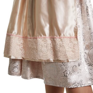 Den skinnende midi dirndl Traunstein er flot, og man kan føle sig godt tilpas i den. Beige og sølv er de definerende farver. Flæser og blondekant understreger halsudskæringen. Det fine bånd løber gennem filigranøjer med rhinsten i snøringen foran. Det perfekt afstemte forklæde med flæser og endnu en blondekant giver tøjet prikken over i'et, materiale: 100% polyester.