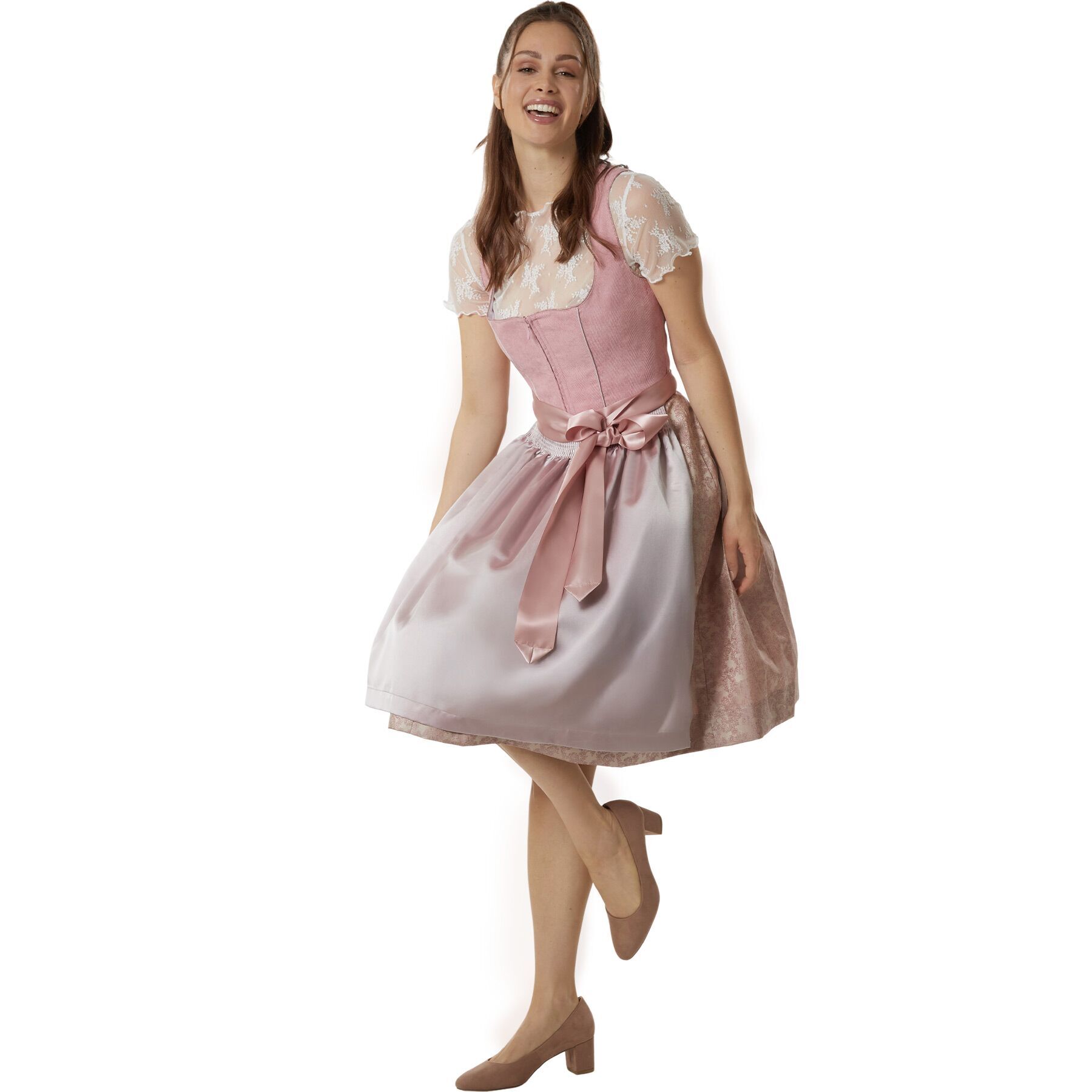 Den hjerteformede udskæring med den fine blondebluse skaber et elegant statement og fremhæver en smuk kavalergang. Livstykket er i gammelrosé og suppleres stilfuldt af skørtet i en skinnende sølvgrå. Den indarbejdede snøring i sløjfe-look ved taljen giver ikke kun et figursyet look, men kan tilpasses individuelt – for maksimal bærekomfort.