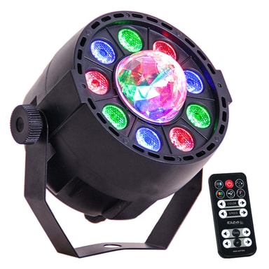2 lyseffekter i en effekt. Projekterer farverige mønstre og lysbjælker på vægge og loft.