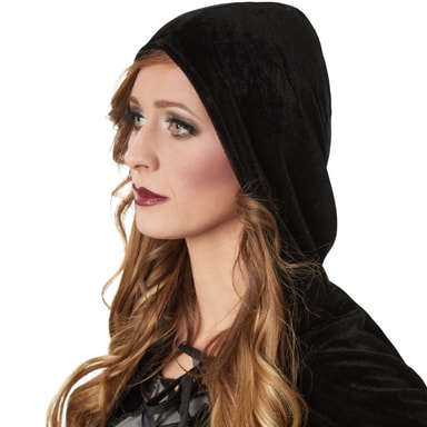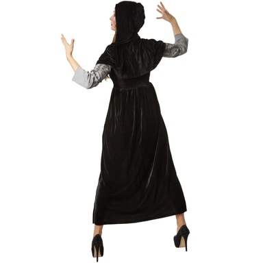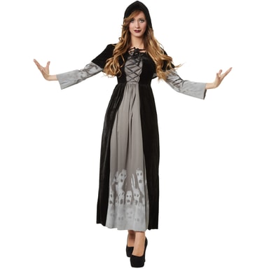 Kvindekostumet, magtfuld magiker, består af en ankellang kjole af sort fløjl og en grå indsats ved armene og fra dekolletéet ned til skørtets afslutning. Ærmerne og den nederste del af skørtet har påtrykte spøgelsesansigter.Læs mere om produktet