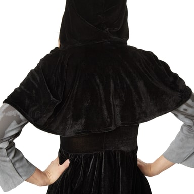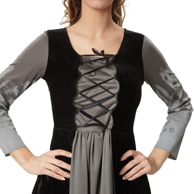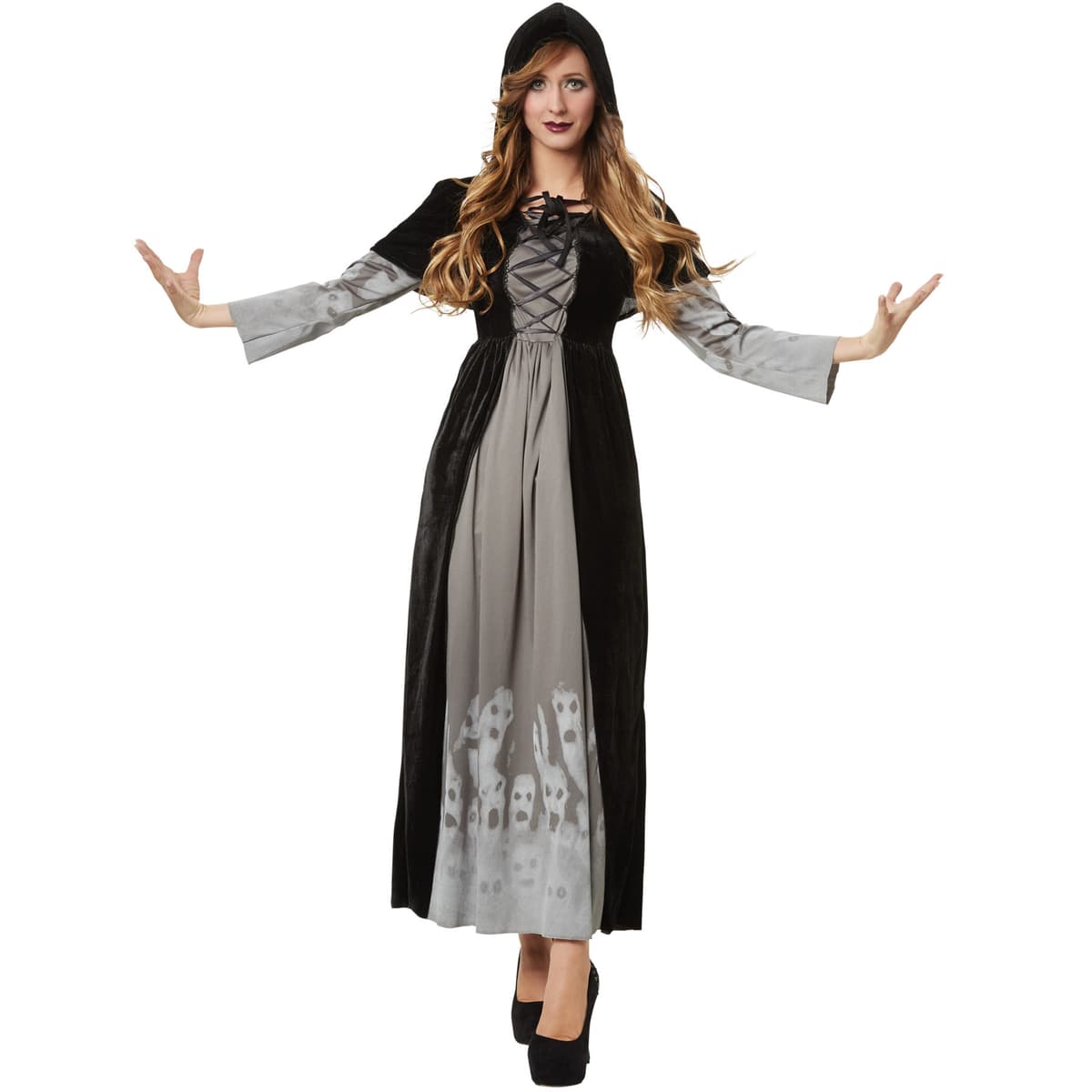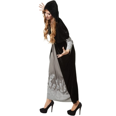 Kvindekostumet, magtfuld magiker, består af en ankellang kjole af sort fløjl og en grå indsats ved armene og fra dekolletéet ned til skørtets afslutning. Ærmerne og den nederste del af skørtet har påtrykte spøgelsesansigter.Læs mere om produktet