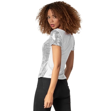 Den yndige kortærmede paillet T-shirt vil være førstevalget til et glamourøst look. Ved lysindfald eller bevægelse funkler og glitrer de utallige, tynde små plader på forsiden og på de korte ærmer fortryllende i flere lag.Læs mere om produktet