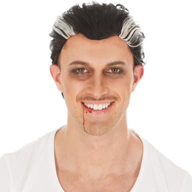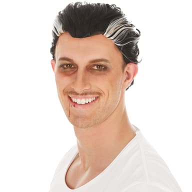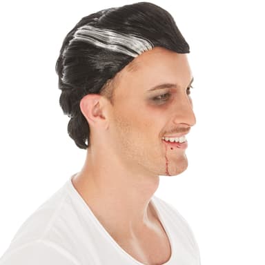 Parykken, Grev Dracula gør dig til en rigtig vampyr. Den er med sort hår og har lysere hår i tindingerne. Hårlængde: Cirka 10 cm. Materiale: 100 % polyester.