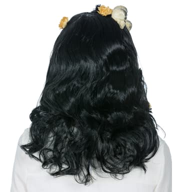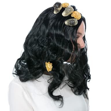 Paryk i fin, mellemlang klipning. Parykken er pyntet med uhyggelige plastic-dødningehoveder og kunstige blomster. Hårlængde cirka 50 cm. Materiale: 100 % polyester.