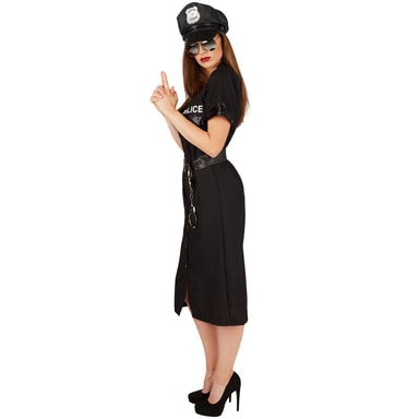 Som politikvinde kan du være sød eller streng! En ting er sikker: Hvem, du end lægger i håndjern, vil blive helt vild! I denne fantastiske kjole sørger du for at få opmærksomheden til alle fester. Det tætsiddende kostume, som er holdt i sort, gør dig til en flot repræsentant for ordensmagten. Der er ingen, der gør noget galt til denne udklædningsfest. Har du altid drømt om at arbejde i politiet? Fastelavn er den perfekte anledning til at gøre krav på forhør af attraktive mænd på dansegulvet. Forresten: med lidt kunstigt blod og den rigtige makeup kan du også sagtens bruge kostumet til Halloween.