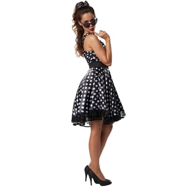 Kvindekostumet, Rockabilly Lady, består af en prikket kjole af glitrende stof. Elastikbæltet og det smukt designede spænde forstærker taljen og deler kostumet optisk op i en over- og underdel. Nederdelen har en påsyet søm af blondestof, begge underskørter er af satin og tyl, materiale: 100 % polyester.