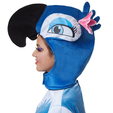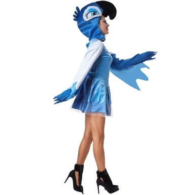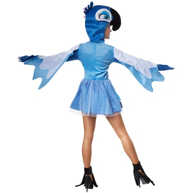 Kvindekostumet, sjov paradisfugl, er lavet af plys og består af en kort kjole, en hat samt benvarmere i klofacon. Den korte kjole med selvklæbende båndlukning i nakken er fremstillet i forskellige blå farvetoner. Kraven har en hvid indsats med takket mønster. Ærmerne er lange og lukket foran i takket mønster, med en åbning på højde med håndleddet. Over ærmerne ligger der to lag stof som fjer; det øverste lag er, ligesom kraveindsatsen, holdt i hvidt. Skørtet er af plys med hvidt lag af tyl udover. Derover hænger der stofstrimler, der gør det ud for fjer. Hatten har en kam, et stort, sort næb og en rosa blomst. De store øjne er foret bagved. En selvklæbende båndlukning lukker hætten i halsen. Benvarmerne har ligeledes selvklæbende båndlukning, materiale: 100% polyester.