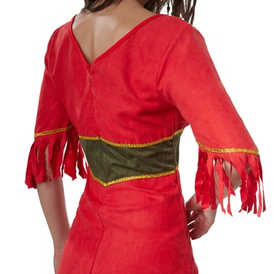 Kvindekostumet, smuk Mohikaner, er en kort kjole i ruskinds-look i farverne rød, oliven og guld. Taljeindsatsen, der går hele vejen rundt, i olivengrønt farvet stof med guldfarvet pyntebort betoner kropsmidten. De korte ærmer er ligeledes dekoreret med en guldfarvet pyntebort og har, ligesom nederdelens søm foran, frynser. Udskæringen er ekstra dyb og markeret foran med olivenfarvede frynser og en guldfarvet pyntebort. En lynlås på ryggen gør det nemmere at iføre sig kostumet, materiale: 100% polyester.